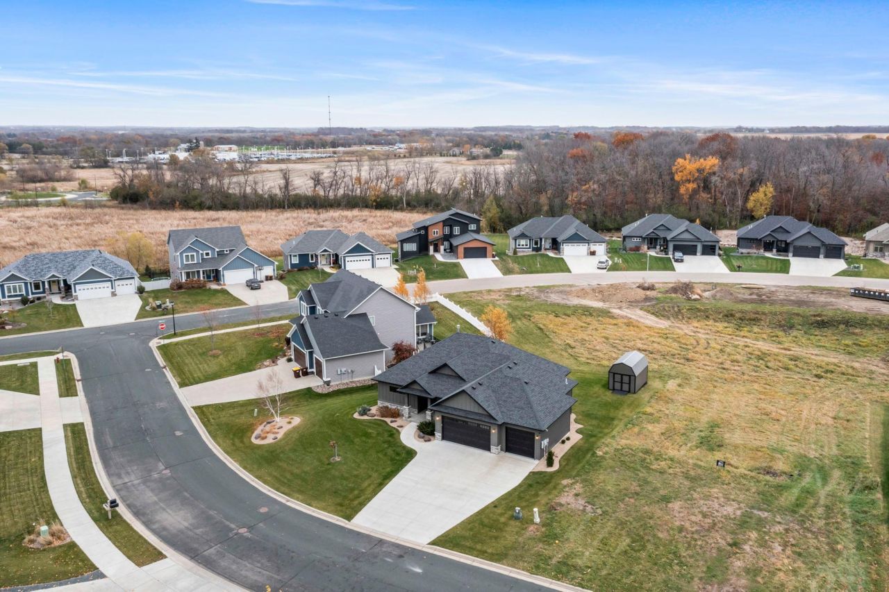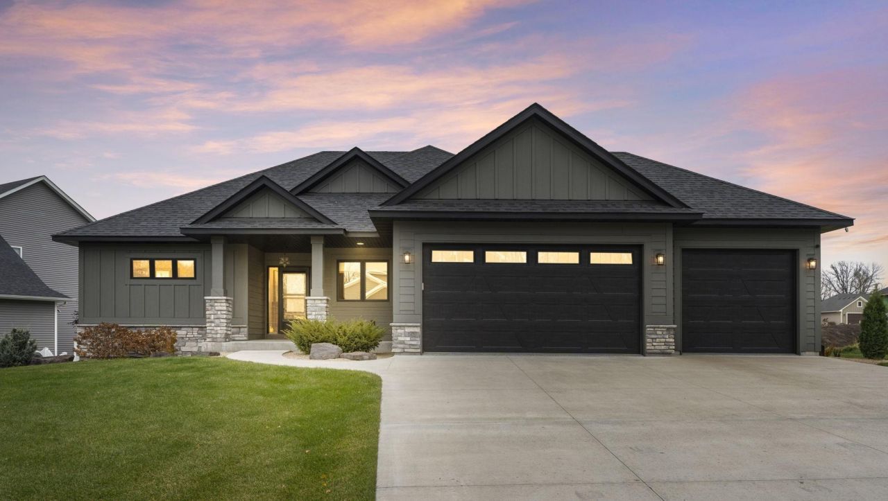 This beautifully crafted custom rambler delivers a striking blend of cozy farmhouse character and modern sophistication. Thoughtful design shines throughout, featuring wide-plank flooring, custom rustic cabinetry, stone accents, and rich charcoal enameled finishes. Sophisticated lighting selections, a sleek modern stair rail, curated wall colors, and warm golden nickel hardware create a polished yet inviting aesthetic. The main level is designed for both comfort and versatility, offering a bedroom that easily doubles as a home office. The primary suite is a true retreat with a designer accent wall, statement lighting, and a spa-inspired ensuite with tile floors, a walk-in tiled shower, a spacious walk-in closet, and convenient access to the main-level laundry. Natural light pours into the open-concept living and dining areas through expansive windows, highlighting the gorgeous wood flooring and creating a bright, welcoming atmosphere. The kitchen is equally stunning, featuring stone countertops, stainless steel appliances, a gas range, a walk-in pantry, and a large island with seating?perfect for casual meals or entertaining guests. Downstairs, the lower level offers even more space to relax and gather, with a spacious family room and kitchenette/wet bar. 2 additional bedrooms with walk-in closets and a full bathroom complete the level, making it ideal for guests or extended living. Additional features include a cozy gas fireplace, in-floor radiant heat, heated epoxy garage floors, heated basement floors, a matching 10x16 backyard storage shed, and a backyard ready for your future deck and outdoor living vision. Situated in the sought-after New Prague community, known for its good schools and small-town charm, this home offers an exceptional combination of style, comfort, and convenience with easy access to the Twin Cities metro. A truly special opportunity you won't want to miss!